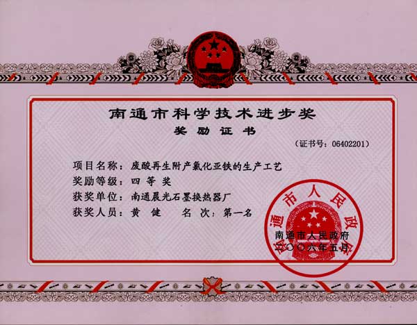 廢酸再生附產(chǎn)氯化亞鐵的生產(chǎn)工藝,榮獲南通市科學技術進步獎,四等獎