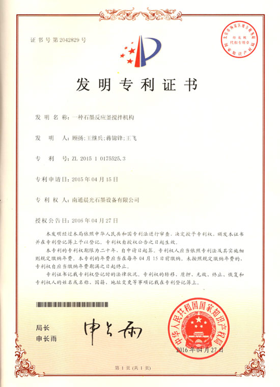 發(fā)明專利 :一種石墨反應釜的攪拌機構 專利號:ZL 2015 1 0175525.3