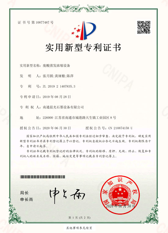 實用新型專利 :廢酸蒸發(fā)濃縮設備 專利號:ZL 2019 2 1407835.3