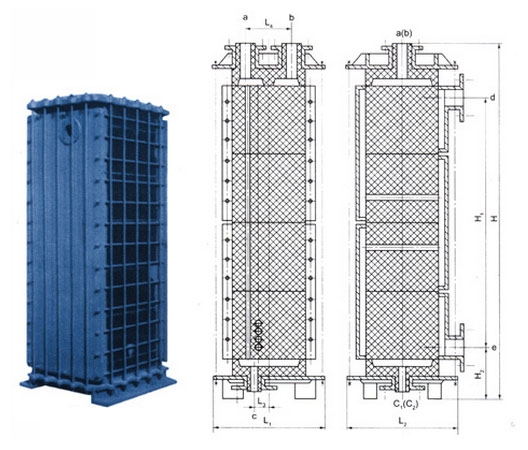 KS型側(cè)板為整體,增加上、下兩排緊固鏍柱,載熱體分布更均勻。相同換熱面積時(shí)矩形塊孔式設(shè)備高度比圓塊式小。本公司可據(jù)用戶要求生產(chǎn)外聯(lián)式、臥式安裝、雙向耐腐蝕等具有其它特性之矩形塊孔式石墨熱交換器。